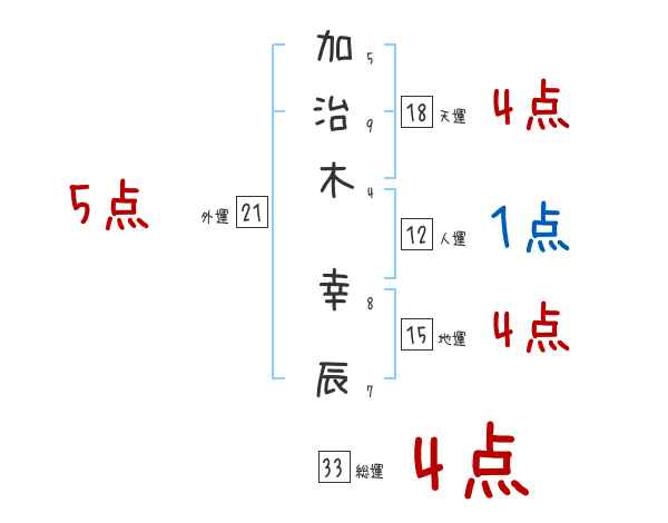 天運![]() | 加治木幸辰さんの天運は18画の4つ星!情熱的で剛気。忍耐力があり信頼される。 家系が持つ宿命的な運勢を表します。祖先から受け継いだ苗字ですので自分の力が及びません。家柄を象徴します。 |