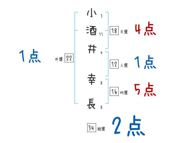 総運![]() | 小酒井幸長さんの総運は34画の2つ星!独創性に優れるが、自尊心が強く災難に注意しましょう。 あなたの人生を表す1番重要な運勢です。生涯を通じて影響する総合運となり、主に50歳以降の晩年期に影響を及ぼします。 |