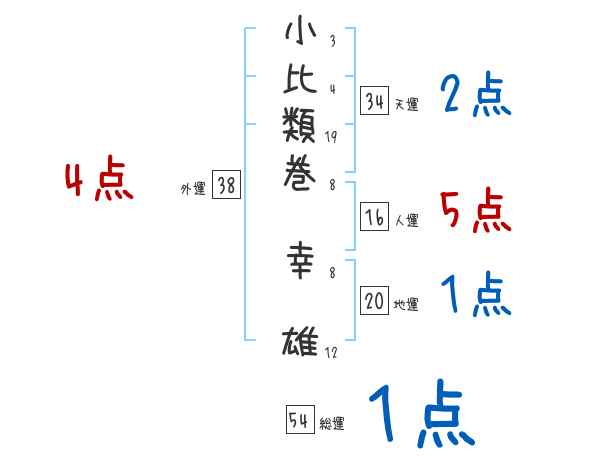 人運![]() | 小比類巻幸雄さんの人運は16画の5つ星!人望が厚く大きく発展する。逆転成功が見える。 性格や才能などを表す2番目に重要な運勢です。人間関係や協調性、社会的な成功に影響します。主に20歳から50歳ぐらいまでの中年期の運勢を表します。 |