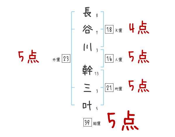 外運![]()  | 長谷川幹三叶さんの外運は23画の5つ星!想像力に優れ活力がある。一代で成功し名誉を手に入れる。 生活面を象徴する運勢です。外部から受ける影響力を表し、結婚運、家庭運や職場、環境への順応性を表します。 |