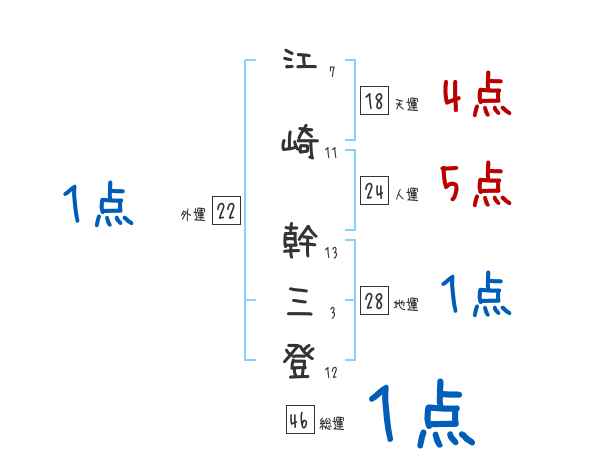 天運![]() | 江崎幹三登さんの天運は18画の4つ星!情熱的で剛気。忍耐力があり信頼される。 家系が持つ宿命的な運勢を表します。祖先から受け継いだ苗字ですので自分の力が及びません。家柄を象徴します。 |