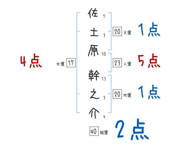 外運![]() | 佐土原幹之介さんの外運は17画の4つ星!積極的な行動力。地位を気づき財産を手に入れる。純粋な心と直感力。 生活面を象徴する運勢です。外部から受ける影響力を表し、結婚運、家庭運や職場、環境への順応性を表します。 |