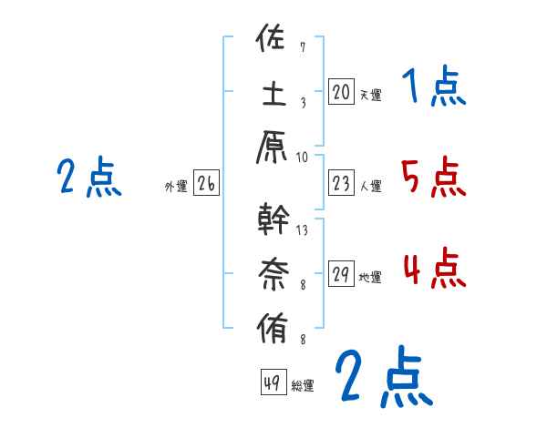 外運![]() | 佐土原幹奈侑さんの外運は26画の2つ星!波瀾万丈かも。信頼できる人を大事にしましょう。 生活面を象徴する運勢です。外部から受ける影響力を表し、結婚運、家庭運や職場、環境への順応性を表します。 |