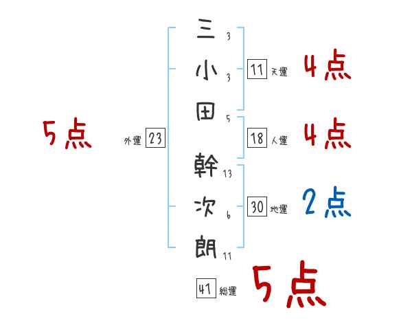 総運![]() | 三小田幹次朗さんの総運は41画の5つ星!大志を抱き、目標に向かって実力を発揮し達成する。温和な性格。 あなたの人生を表す1番重要な運勢です。生涯を通じて影響する総合運となり、主に50歳以降の晩年期に影響を及ぼします。 |