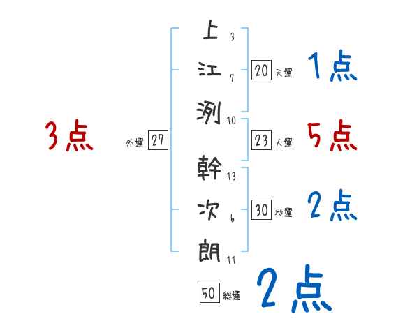 人運![]() | 上江洌幹次朗さんの人運は23画の5つ星!想像力に優れ活力がある。一代で成功し名誉を手に入れる。 性格や才能などを表す2番目に重要な運勢です。人間関係や協調性、社会的な成功に影響します。主に20歳から50歳ぐらいまでの中年期の運勢を表します。 |