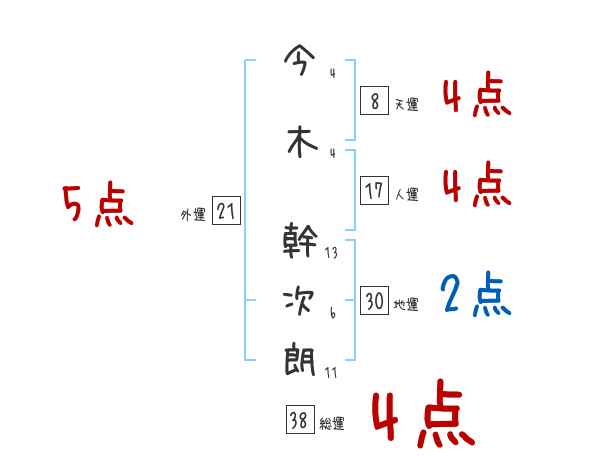 天運![]() | 今木幹次朗さんの天運は8画の4つ星!勤勉家。根気強く努力し成功する。忍耐力がある。 家系が持つ宿命的な運勢を表します。祖先から受け継いだ苗字ですので自分の力が及びません。家柄を象徴します。 |