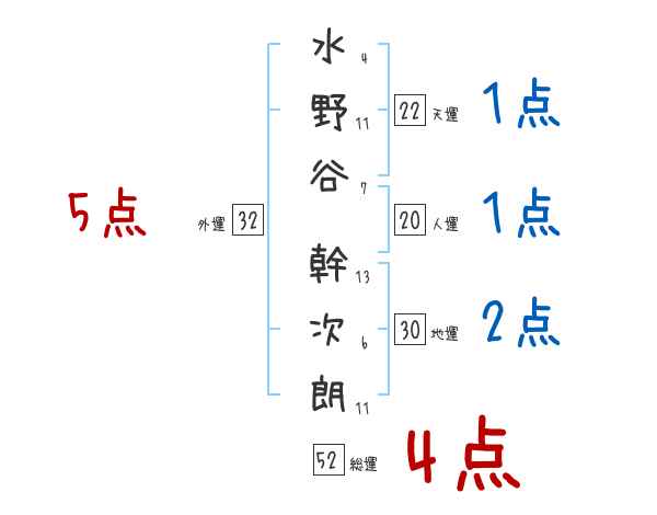 外運![]() | 水野谷幹次朗さんの外運は32画の5つ星!柔軟性があり成功する。チャンスが多く金運が良い。 生活面を象徴する運勢です。外部から受ける影響力を表し、結婚運、家庭運や職場、環境への順応性を表します。 |