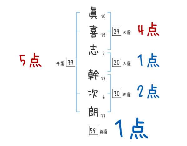 天運![]() | 眞喜志幹次朗さんの天運は29画の4つ星!完全主義で才能がある。厳格な心の持ち主。 家系が持つ宿命的な運勢を表します。祖先から受け継いだ苗字ですので自分の力が及びません。家柄を象徴します。 |