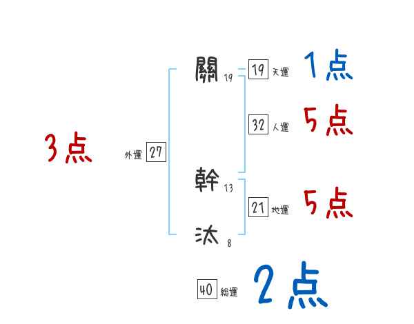 人運![]() | 關幹汰さんの人運は32画の5つ星!柔軟性があり成功する。チャンスが多く金運が良い。 性格や才能などを表す2番目に重要な運勢です。人間関係や協調性、社会的な成功に影響します。主に20歳から50歳ぐらいまでの中年期の運勢を表します。 |