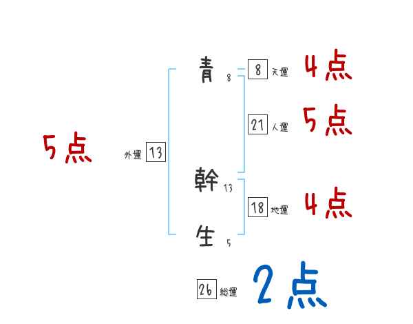 天運![]() | 青幹生さんの天運は8画の4つ星!勤勉家。根気強く努力し成功する。忍耐力がある。 家系が持つ宿命的な運勢を表します。祖先から受け継いだ苗字ですので自分の力が及びません。家柄を象徴します。 |