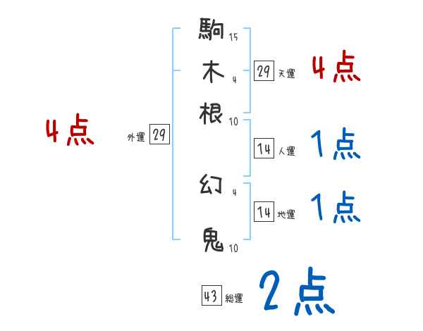 天運![]() | 駒木根幻鬼さんの天運は29画の4つ星!完全主義で才能がある。厳格な心の持ち主。 家系が持つ宿命的な運勢を表します。祖先から受け継いだ苗字ですので自分の力が及びません。家柄を象徴します。 |