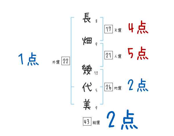 人運![]() | 長畑幾代美さんの人運は21画の5つ星!統率力がある。独立し成功する。名誉を手に入れる。 性格や才能などを表す2番目に重要な運勢です。人間関係や協調性、社会的な成功に影響します。主に20歳から50歳ぐらいまでの中年期の運勢を表します。 |