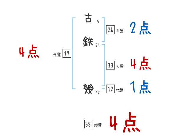 天運![]() | 古鉄幾さんの天運は26画の2つ星!波瀾万丈かも。信頼できる人を大事にしましょう。 家系が持つ宿命的な運勢を表します。祖先から受け継いだ苗字ですので自分の力が及びません。家柄を象徴します。 |