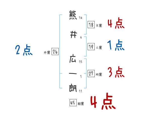 天運![]() | 熊井広一朗さんの天運は18画の4つ星!情熱的で剛気。忍耐力があり信頼される。 家系が持つ宿命的な運勢を表します。祖先から受け継いだ苗字ですので自分の力が及びません。家柄を象徴します。 |
