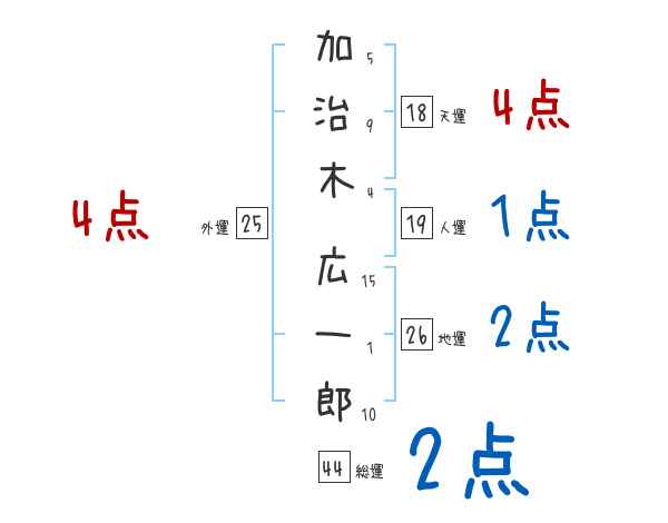 総運![]() | 加治木広一郎さんの総運は44画の2つ星!誠実で慎重な性格。物事を考えすぎないように注意しましょう。 あなたの人生を表す1番重要な運勢です。生涯を通じて影響する総合運となり、主に50歳以降の晩年期に影響を及ぼします。 |