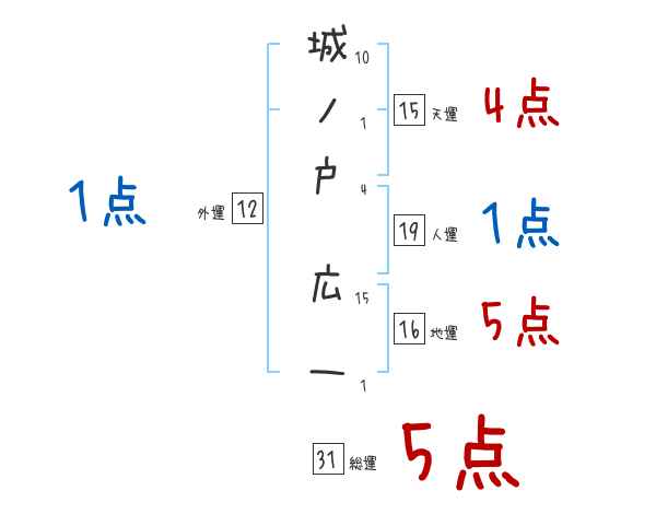 天運![]() | 城ノ戸広一さんの天運は15画の4つ星!人徳があり出世する。順調に物事を進め円満な人生。 家系が持つ宿命的な運勢を表します。祖先から受け継いだ苗字ですので自分の力が及びません。家柄を象徴します。 |