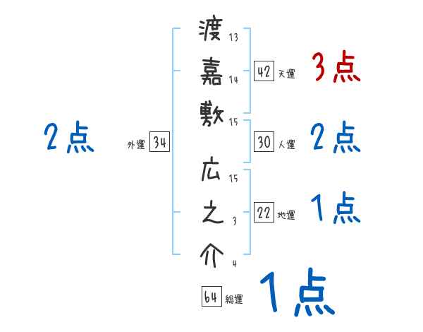 天運![]() | 渡嘉敷広之介さんの天運は42画の3つ星!病気に注意。多芸であるが消極的でおとなしい。 家系が持つ宿命的な運勢を表します。祖先から受け継いだ苗字ですので自分の力が及びません。家柄を象徴します。 |