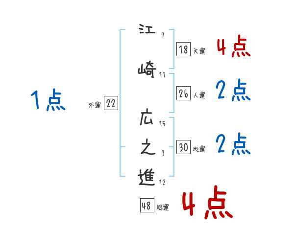 天運![]() | 江崎広之進さんの天運は18画の4つ星!情熱的で剛気。忍耐力があり信頼される。 家系が持つ宿命的な運勢を表します。祖先から受け継いだ苗字ですので自分の力が及びません。家柄を象徴します。 |