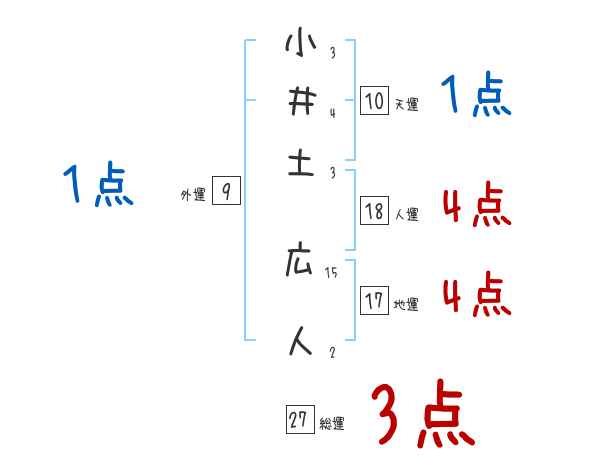 人運![]() | 小井土広人さんの人運は18画の4つ星!情熱的で剛気。忍耐力があり信頼される。 性格や才能などを表す2番目に重要な運勢です。人間関係や協調性、社会的な成功に影響します。主に20歳から50歳ぐらいまでの中年期の運勢を表します。 |