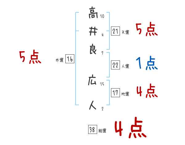 外運![]() | 高井良広人さんの外運は16画の5つ星!人望が厚く大きく発展する。逆転成功が見える。 生活面を象徴する運勢です。外部から受ける影響力を表し、結婚運、家庭運や職場、環境への順応性を表します。 |