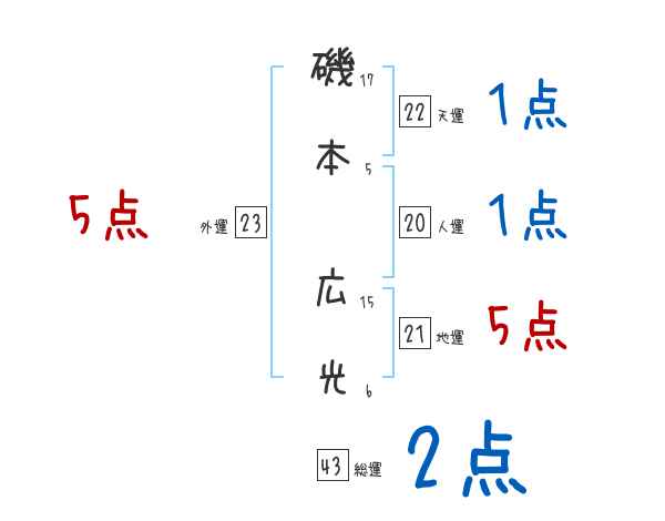 外運![]() | 磯本広光さんの外運は23画の5つ星!想像力に優れ活力がある。一代で成功し名誉を手に入れる。 生活面を象徴する運勢です。外部から受ける影響力を表し、結婚運、家庭運や職場、環境への順応性を表します。 |