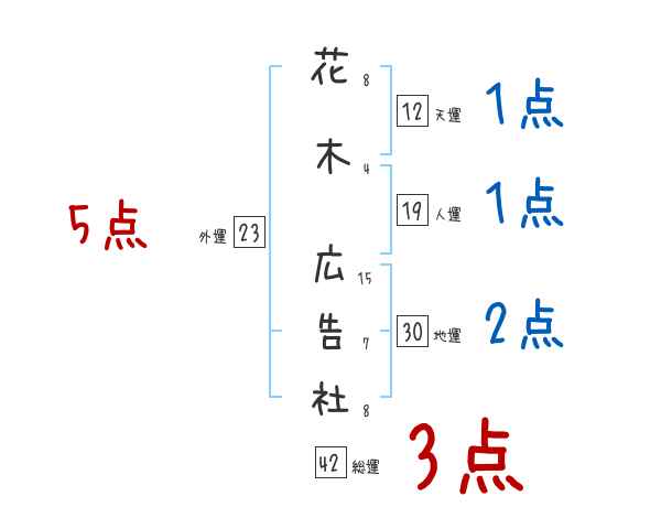 人運![]() | 花木広告社さんの人運は19画の1つ星!優れた才能を持ちますが、協調性が足りないことも。周りの人と協力する事を意識しましょう。 性格や才能などを表す2番目に重要な運勢です。人間関係や協調性、社会的な成功に影響します。主に20歳から50歳ぐらいまでの中年期の運勢を表します。 |