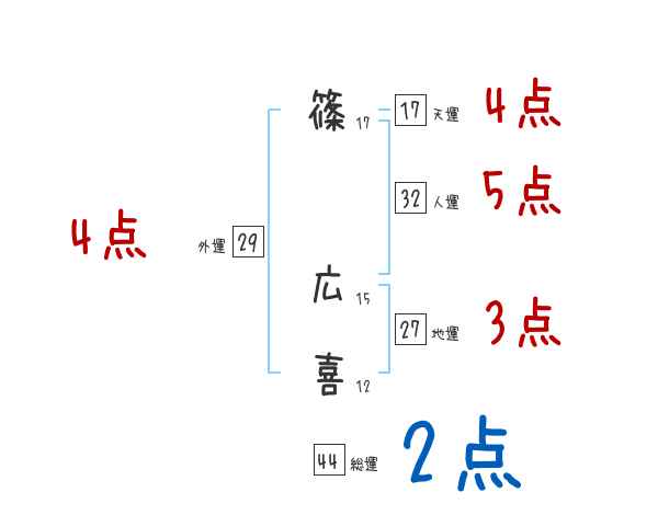 天運![]() | 篠広喜さんの天運は17画の4つ星!積極的な行動力。地位を気づき財産を手に入れる。純粋な心と直感力。 家系が持つ宿命的な運勢を表します。祖先から受け継いだ苗字ですので自分の力が及びません。家柄を象徴します。 |
