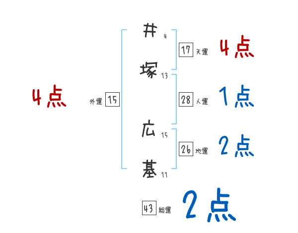 総運![]() | 井塚広基さんの総運は43画の2つ星!頑固な性格で独立心が強いかも。やや非現実的で浪費に注意しましょう。 あなたの人生を表す1番重要な運勢です。生涯を通じて影響する総合運となり、主に50歳以降の晩年期に影響を及ぼします。 |