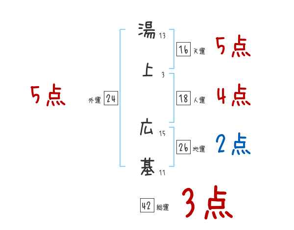 外運![]() | 湯上広基さんの外運は24画の5つ星!家庭運が良く順調な人生。金運にも恵まれる。 生活面を象徴する運勢です。外部から受ける影響力を表し、結婚運、家庭運や職場、環境への順応性を表します。 |