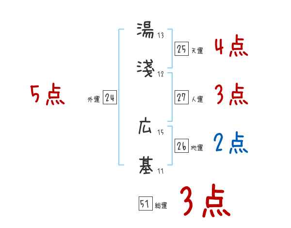 外運![]() | 湯淺広基さんの外運は24画の5つ星!家庭運が良く順調な人生。金運にも恵まれる。 生活面を象徴する運勢です。外部から受ける影響力を表し、結婚運、家庭運や職場、環境への順応性を表します。 |