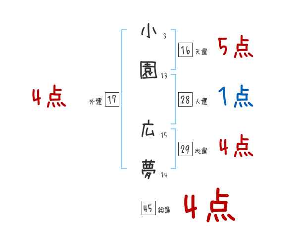 天運![]() | 小園広夢さんの天運は16画の5つ星!人望が厚く大きく発展する。逆転成功が見える。 家系が持つ宿命的な運勢を表します。祖先から受け継いだ苗字ですので自分の力が及びません。家柄を象徴します。 |