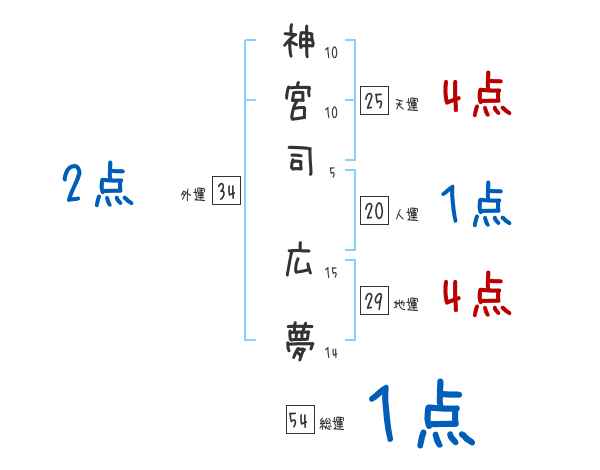 天運![]() | 神宮司広夢さんの天運は25画の4つ星!個性があり才能があふれる。強運の持ち主で発展する。 家系が持つ宿命的な運勢を表します。祖先から受け継いだ苗字ですので自分の力が及びません。家柄を象徴します。 |