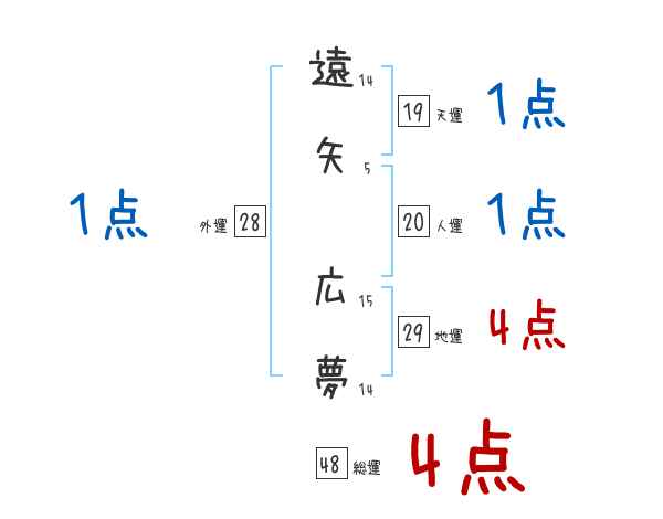 総運![]() | 遠矢広夢さんの総運は48画の4つ星!賢明な性格で人望が厚い。指導力があり多くの人に尊敬される。 あなたの人生を表す1番重要な運勢です。生涯を通じて影響する総合運となり、主に50歳以降の晩年期に影響を及ぼします。 |