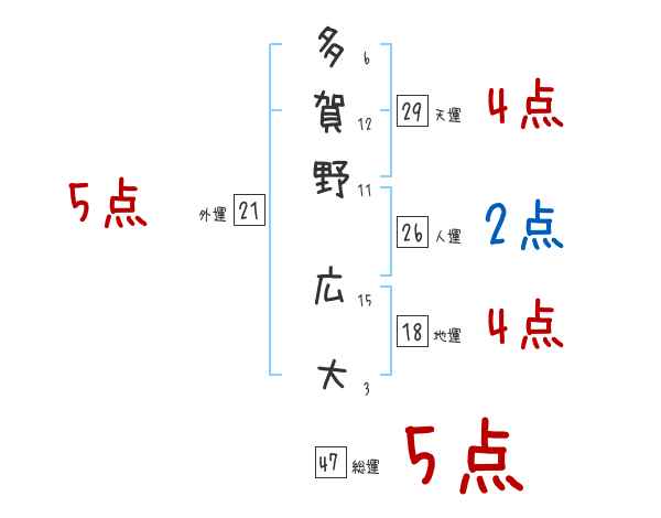 総運![]() | 多賀野広大さんの総運は47画の5つ星!実力が開花し発展する円満な人生。財に恵まれる。 あなたの人生を表す1番重要な運勢です。生涯を通じて影響する総合運となり、主に50歳以降の晩年期に影響を及ぼします。 |