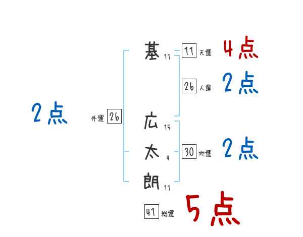 天運![]() | 基広太朗さんの天運は11画の4つ星!着実に富や地位を得る幸運な人生。 家系が持つ宿命的な運勢を表します。祖先から受け継いだ苗字ですので自分の力が及びません。家柄を象徴します。 |