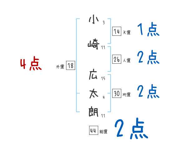 総運![]() | 小崎広太朗さんの総運は44画の2つ星!誠実で慎重な性格。物事を考えすぎないように注意しましょう。 あなたの人生を表す1番重要な運勢です。生涯を通じて影響する総合運となり、主に50歳以降の晩年期に影響を及ぼします。 |