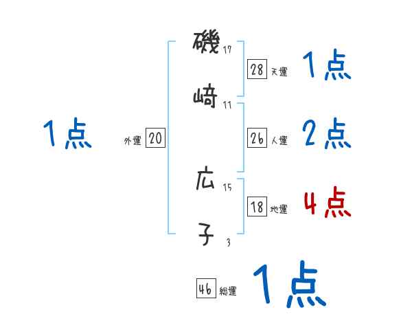 天運![]() | 磯﨑広子さんの天運は28画の1つ星!家庭環境に注意。スポーツで活躍できる能力があるかも。 家系が持つ宿命的な運勢を表します。祖先から受け継いだ苗字ですので自分の力が及びません。家柄を象徴します。 |