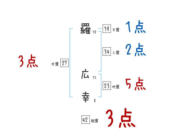 天運![]() | 羅広幸さんの天運は19画の1つ星!優れた才能を持ちますが、協調性が足りないことも。周りの人と協力する事を意識しましょう。 家系が持つ宿命的な運勢を表します。祖先から受け継いだ苗字ですので自分の力が及びません。家柄を象徴します。 |