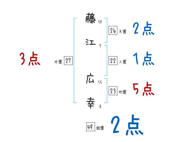 天運![]() | 藤江広幸さんの天運は26画の2つ星!波瀾万丈かも。信頼できる人を大事にしましょう。 家系が持つ宿命的な運勢を表します。祖先から受け継いだ苗字ですので自分の力が及びません。家柄を象徴します。 |