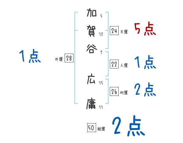 外運![]() | 加賀谷広庸さんの外運は28画の1つ星!家庭環境に注意。スポーツで活躍できる能力があるかも。 生活面を象徴する運勢です。外部から受ける影響力を表し、結婚運、家庭運や職場、環境への順応性を表します。 |