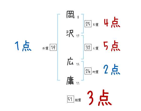 総運![]() | 岡沢広庸さんの総運は51画の3つ星!変化が激しく、危険に注意。堅実な性格。 あなたの人生を表す1番重要な運勢です。生涯を通じて影響する総合運となり、主に50歳以降の晩年期に影響を及ぼします。 |