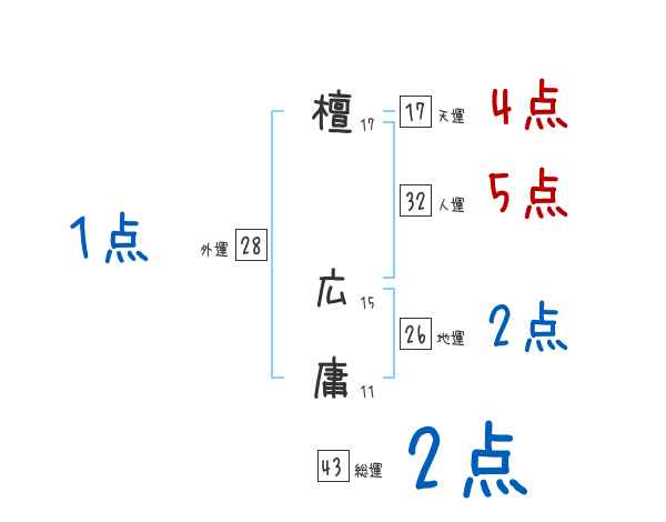 総運![]() | 檀広庸さんの総運は43画の2つ星!頑固な性格で独立心が強いかも。やや非現実的で浪費に注意しましょう。 あなたの人生を表す1番重要な運勢です。生涯を通じて影響する総合運となり、主に50歳以降の晩年期に影響を及ぼします。 |