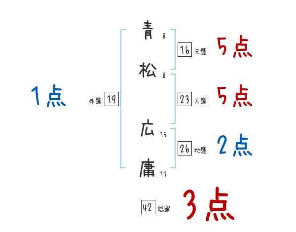 総運![]() | 青松広庸さんの総運は42画の3つ星!病気に注意。多芸であるが消極的でおとなしい。 あなたの人生を表す1番重要な運勢です。生涯を通じて影響する総合運となり、主に50歳以降の晩年期に影響を及ぼします。 |