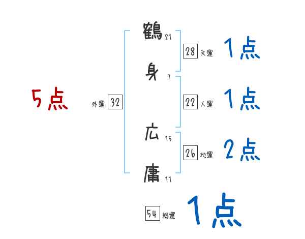 外運![]() | 鶴身広庸さんの外運は32画の5つ星!柔軟性があり成功する。チャンスが多く金運が良い。 生活面を象徴する運勢です。外部から受ける影響力を表し、結婚運、家庭運や職場、環境への順応性を表します。 |