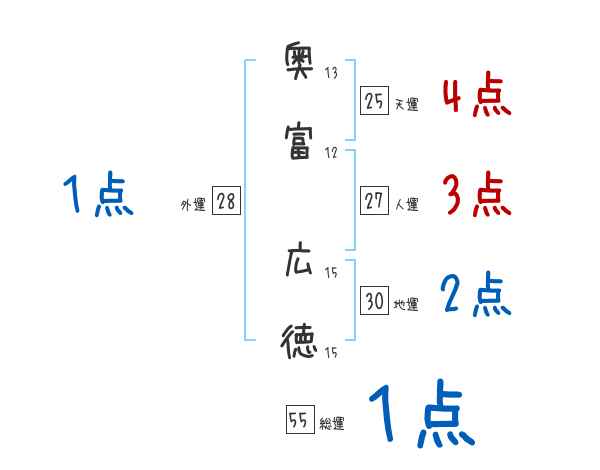 天運![]() | 奥富広徳さんの天運は25画の4つ星!個性があり才能があふれる。強運の持ち主で発展する。 家系が持つ宿命的な運勢を表します。祖先から受け継いだ苗字ですので自分の力が及びません。家柄を象徴します。 |