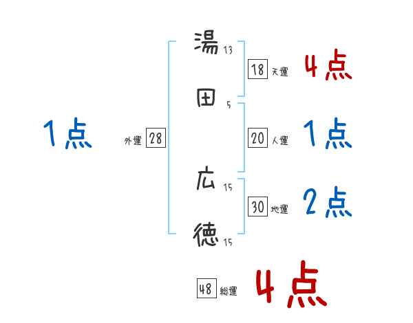 天運![]() | 湯田広徳さんの天運は18画の4つ星!情熱的で剛気。忍耐力があり信頼される。 家系が持つ宿命的な運勢を表します。祖先から受け継いだ苗字ですので自分の力が及びません。家柄を象徴します。 |