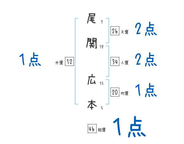 天運![]() | 尾関広本さんの天運は26画の2つ星!波瀾万丈かも。信頼できる人を大事にしましょう。 家系が持つ宿命的な運勢を表します。祖先から受け継いだ苗字ですので自分の力が及びません。家柄を象徴します。 |