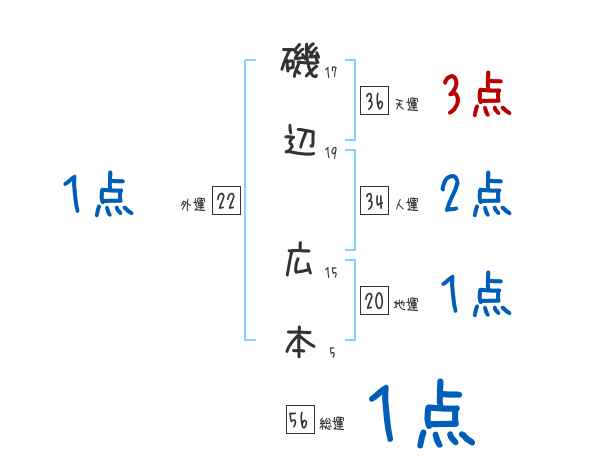 外運![]() | 磯辺広本さんの外運は22画の1つ星!努力することが苦手ないっぽう手先が器用。芸術性にも優れる。 生活面を象徴する運勢です。外部から受ける影響力を表し、結婚運、家庭運や職場、環境への順応性を表します。 |