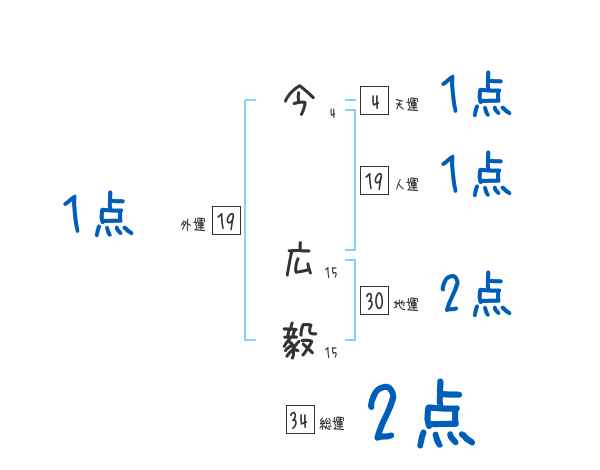 外運![]() | 今広毅さんの外運は19画の1つ星!優れた才能を持ちますが、協調性が足りないことも。周りの人と協力する事を意識しましょう。 生活面を象徴する運勢です。外部から受ける影響力を表し、結婚運、家庭運や職場、環境への順応性を表します。 |