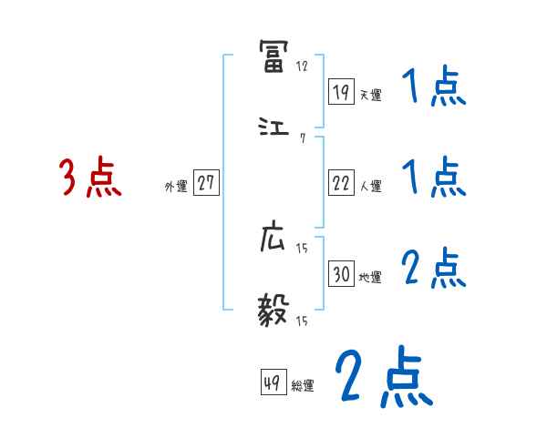 天運![]() | 冨江広毅さんの天運は19画の1つ星!優れた才能を持ちますが、協調性が足りないことも。周りの人と協力する事を意識しましょう。 家系が持つ宿命的な運勢を表します。祖先から受け継いだ苗字ですので自分の力が及びません。家柄を象徴します。 |